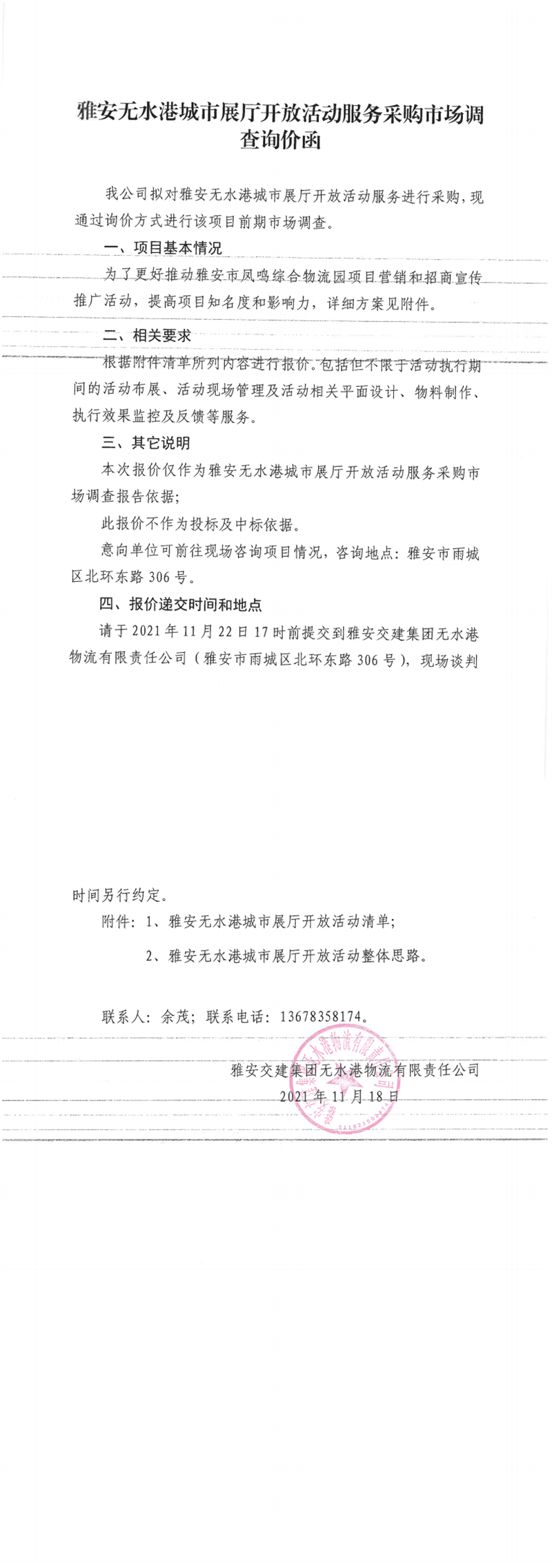 雅安交建集團無水港物流有限責任公司雅安無水港城市展廳開放活動服務(wù)采購市場調(diào)查詢價函