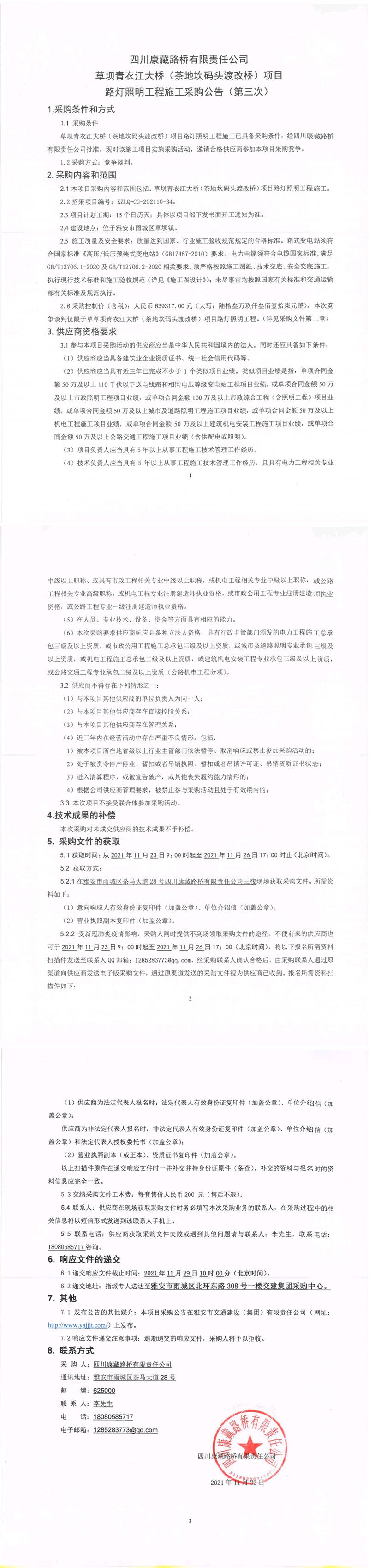 四川康藏路橋有限責(zé)任公司草壩青衣江大橋(茶地坎碼頭渡改橋)項目路燈照明工程施工采購公告(第三次)