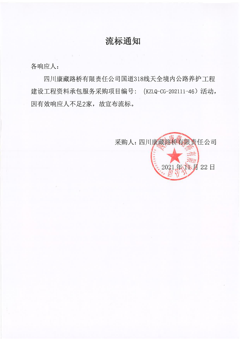 四川康藏路橋有限責(zé)任公司國道318線天全境內(nèi)公路養(yǎng)護(hù)工程建設(shè)工程資料承包服務(wù)采購流標(biāo)通知