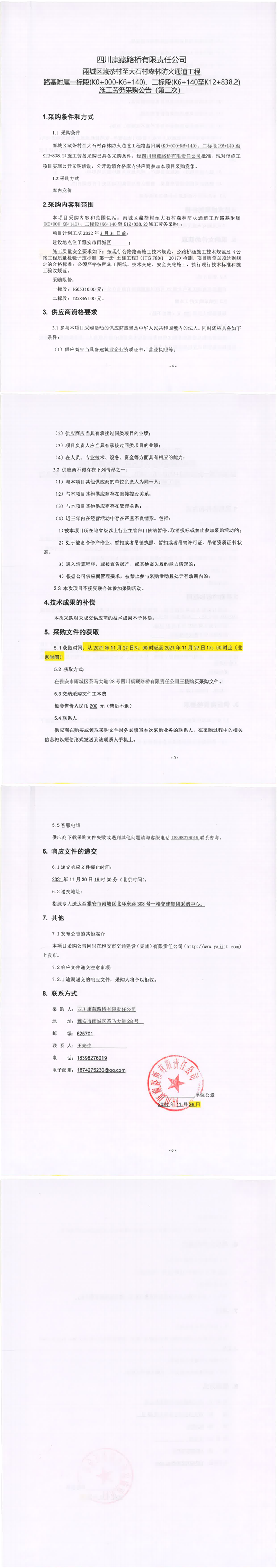 四川康藏路橋有限責(zé)任公司雨城區(qū)藏茶村至大石村森林防火通道工程路基附屬一標(biāo)段(K0+000-K6+140)、二標(biāo)段(K6+140至K12+838.2)施工勞務(wù)采購公告(第二次)