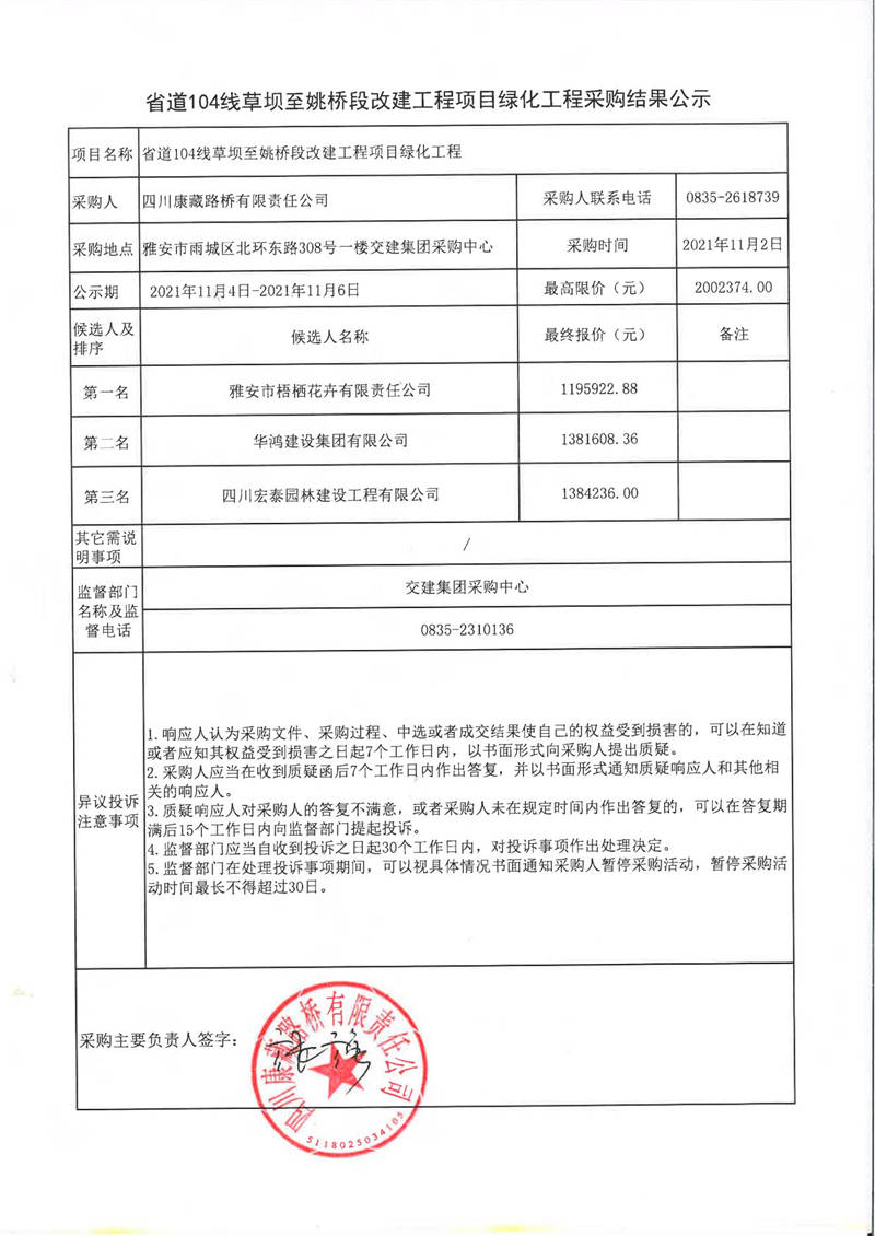 四川康藏路橋有限責(zé)任公司省道104線草壩至姚橋段改建工程項目綠化工程采購結(jié)果公示