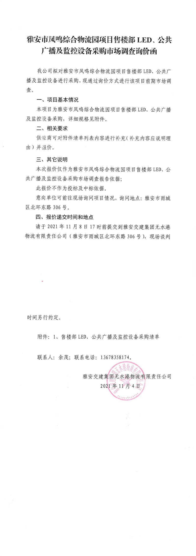 雅安交建集團(tuán)無(wú)水港物流有限責(zé)任公司雅安市鳳鳴綜合物流園項(xiàng)目售樓部LED、公共廣播及監(jiān)控設(shè)備采購(gòu)市場(chǎng)調(diào)查詢價(jià)函