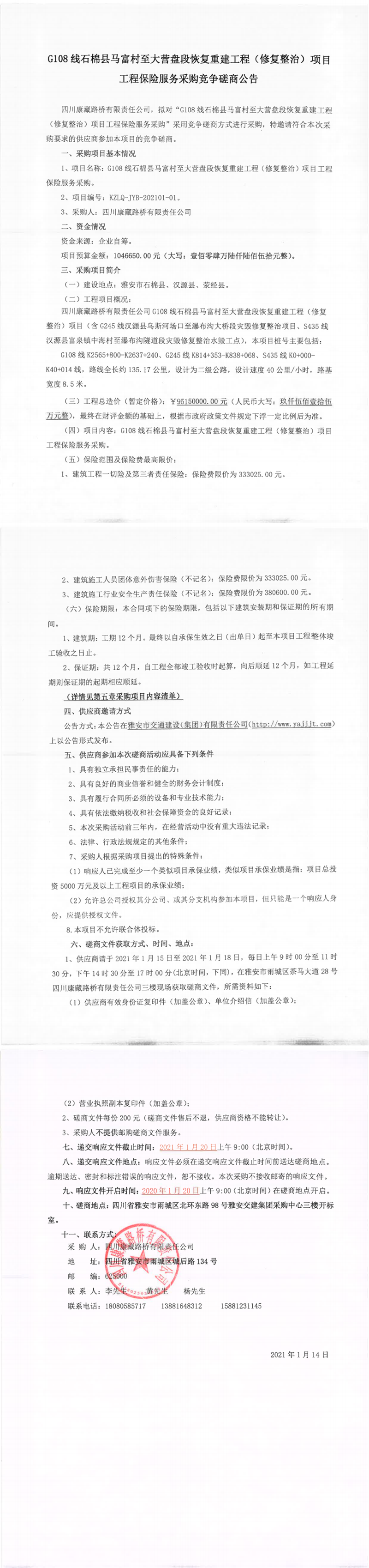 四川康藏路橋有限公司G108線石棉縣馬富村至大營盤段恢復(fù)重建工程(修復(fù)整治)項目工程保險服務(wù)采購競爭磋商公告