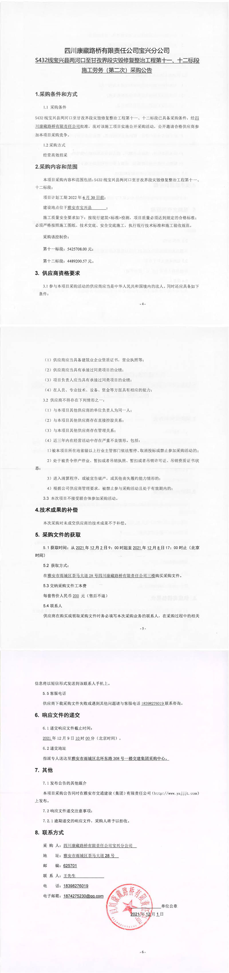 四川康藏路橋有限責(zé)任公司S432線寶興縣兩河口至甘孜界段災(zāi)毀修復(fù)整治工程第十一、十二標(biāo)段施工勞務(wù)(第二次)采購(gòu)公告