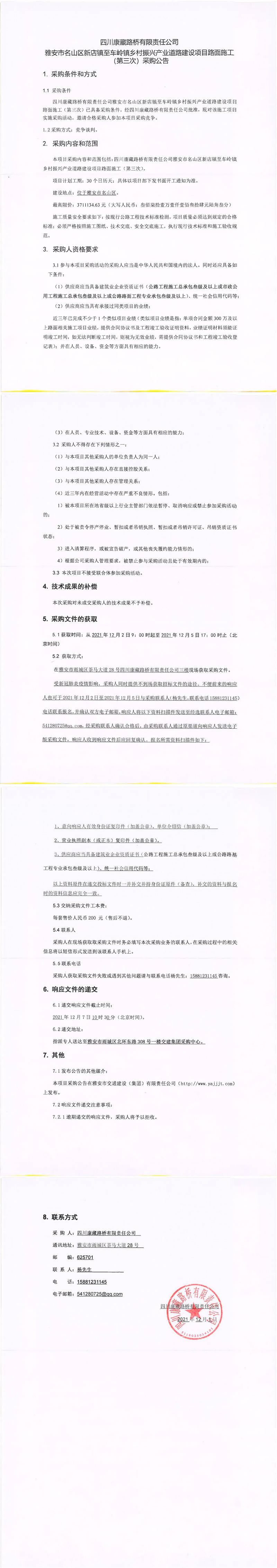 四川康藏路橋有限責(zé)任公司雅安市名山區(qū)新店鎮(zhèn)至車嶺鎮(zhèn)鄉(xiāng)村振興產(chǎn)業(yè)道路建設(shè)項目路面施工(第三次)采購公告