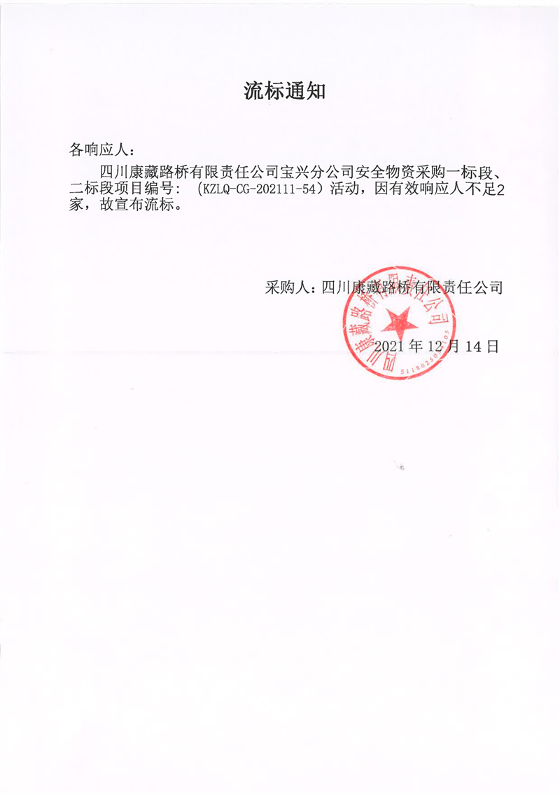 四川康藏路橋有限責(zé)任公司寶興分公司安全物資采購一標(biāo)段、二標(biāo)段項(xiàng)目流標(biāo)通知