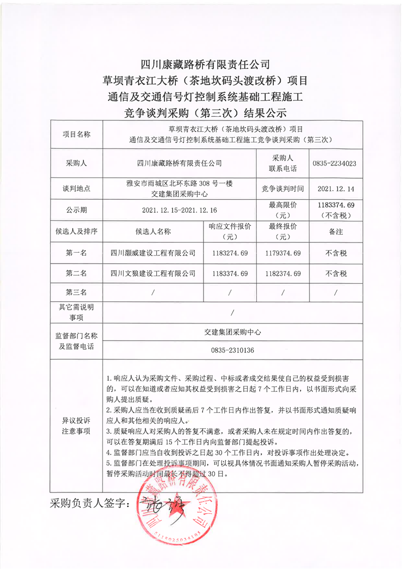四川康藏路橋有限責(zé)任公司草壩青衣江大橋(茶地坎碼頭渡改橋)項(xiàng)目通信及交通信號(hào)燈控制系統(tǒng)基礎(chǔ)工程施工競爭談判采購(第三次)結(jié)果公示