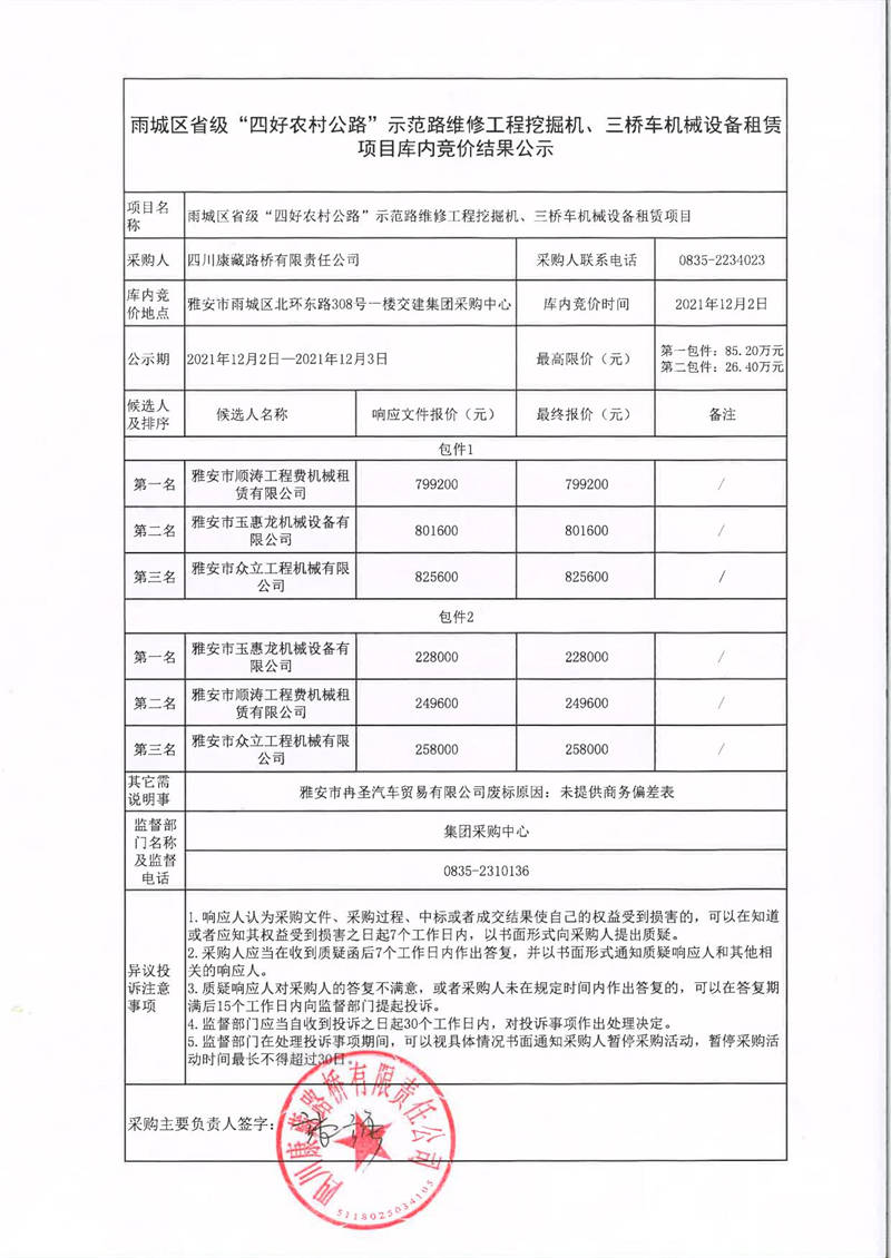 四川康藏路橋有限責任公司雨城區(qū)省級“四好農(nóng)村路”示范路維修工程挖掘機、三橋車機械設(shè)備租賃項目庫內(nèi)競價結(jié)果公示