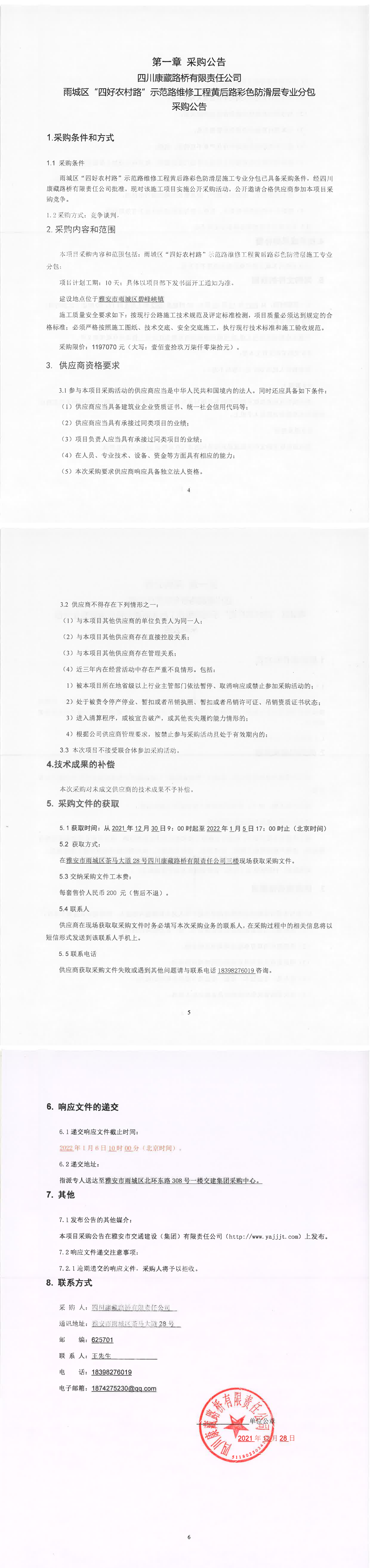 四川康藏路橋有限責(zé)任公司雨城區(qū)“四好農(nóng)村路”示范路維修工程黃后路彩色防滑層專業(yè)分包采購(gòu)公告