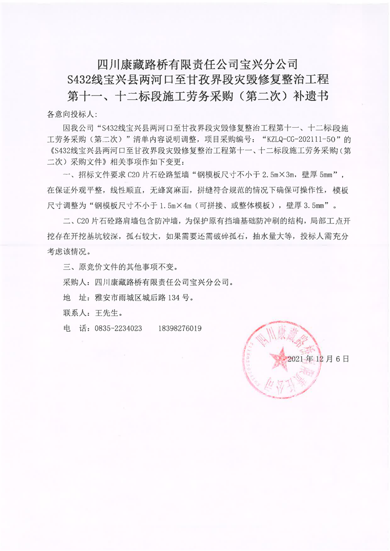 四川康藏路橋有限責任公司S432線寶興縣兩河口至甘孜界段災毀修復整治工程第十一、十二標段施工勞務采購(第二次)補遺書