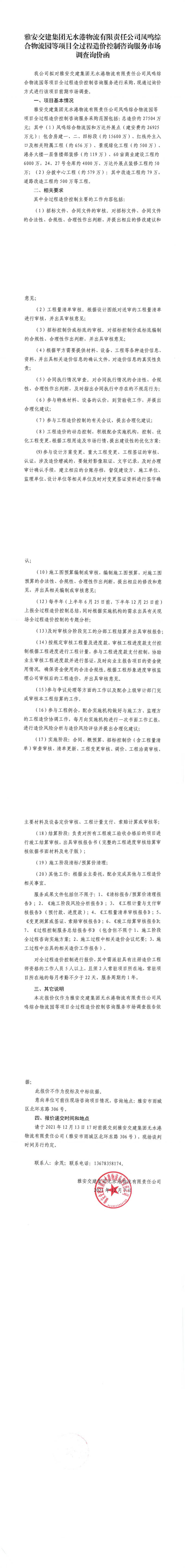 雅安交建集團(tuán)無(wú)水港物流有限責(zé)任公司鳳鳴綜合物流園等項(xiàng)目全過程造價(jià)控制咨詢服務(wù)市場(chǎng)調(diào)查詢價(jià)函
