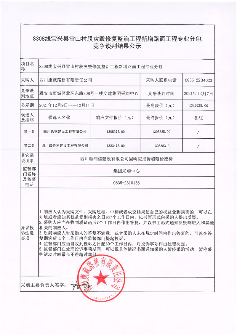四川康藏路橋有限責任公司S308線寶興縣雪山村段災(zāi)毀修復(fù)整治工程新增路面工程專業(yè)分包競爭談判結(jié)果公示