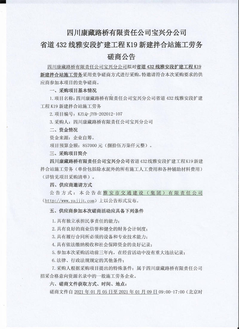 四川康藏路橋有限責(zé)任公司寶興分公司省道432線雅安段擴建工程K19新建拌合站施工勞務(wù)磋商公告(第二次)