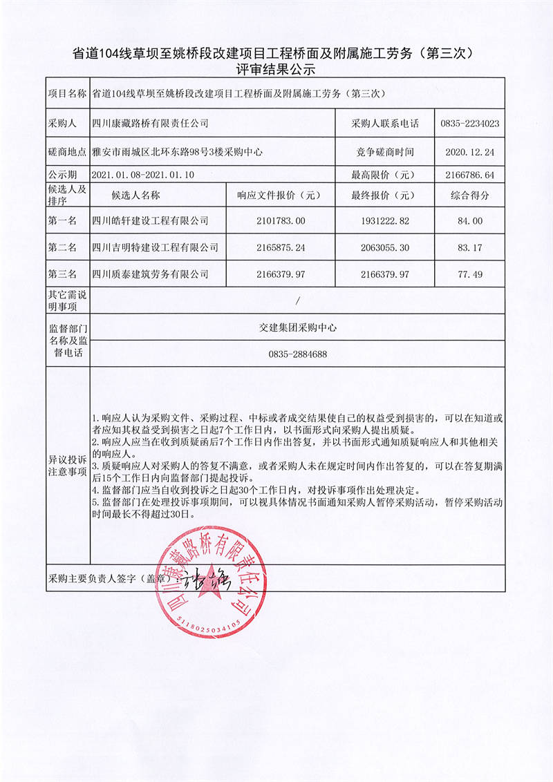 四川康藏路橋有限責(zé)任公司省道104線草壩至姚橋段改建項(xiàng)目工程橋面及附屬施工勞務(wù)(第三次)評(píng)審結(jié)果公示