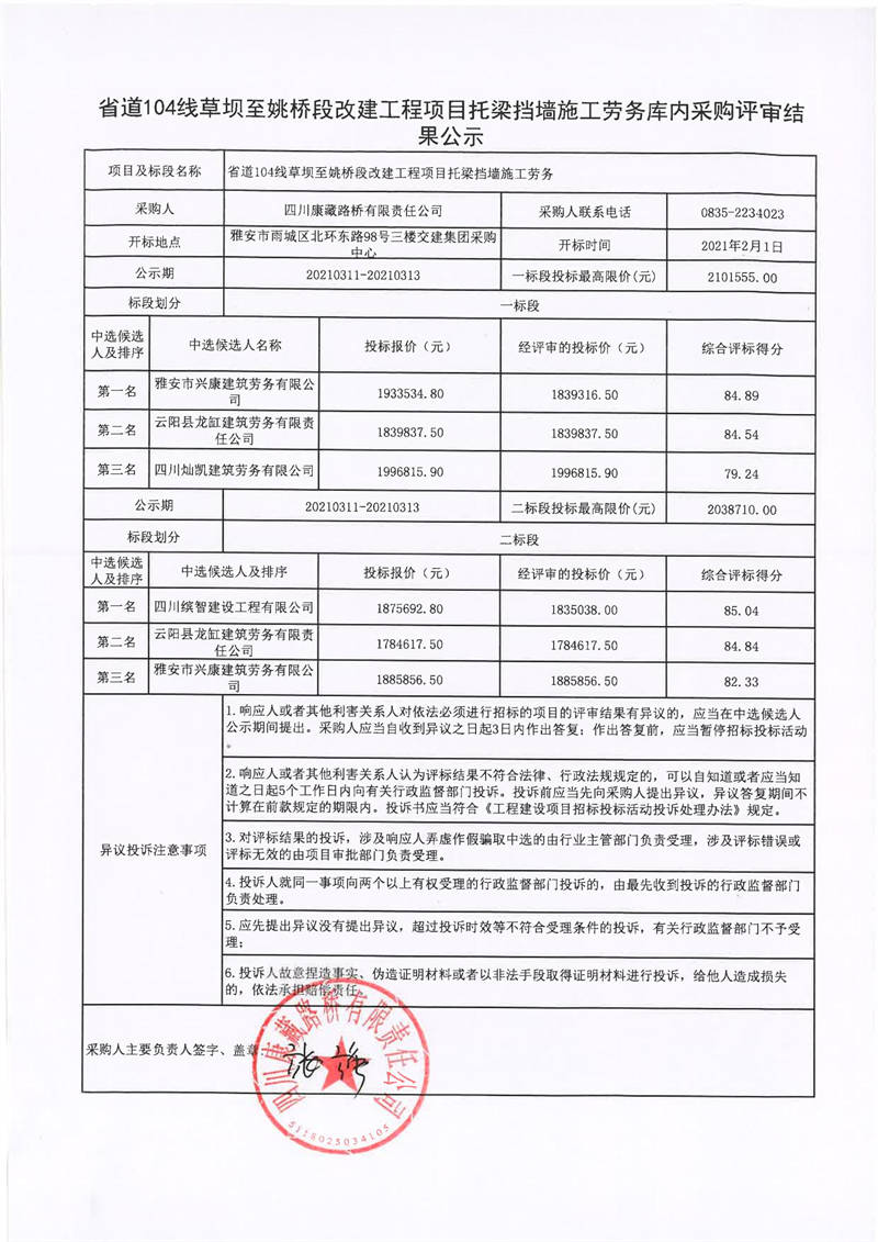四川康藏路橋有限責(zé)任公司省道104線草壩至姚橋段改建工程項(xiàng)目托梁擋墻施工勞務(wù)庫內(nèi)采購評審結(jié)果公示
