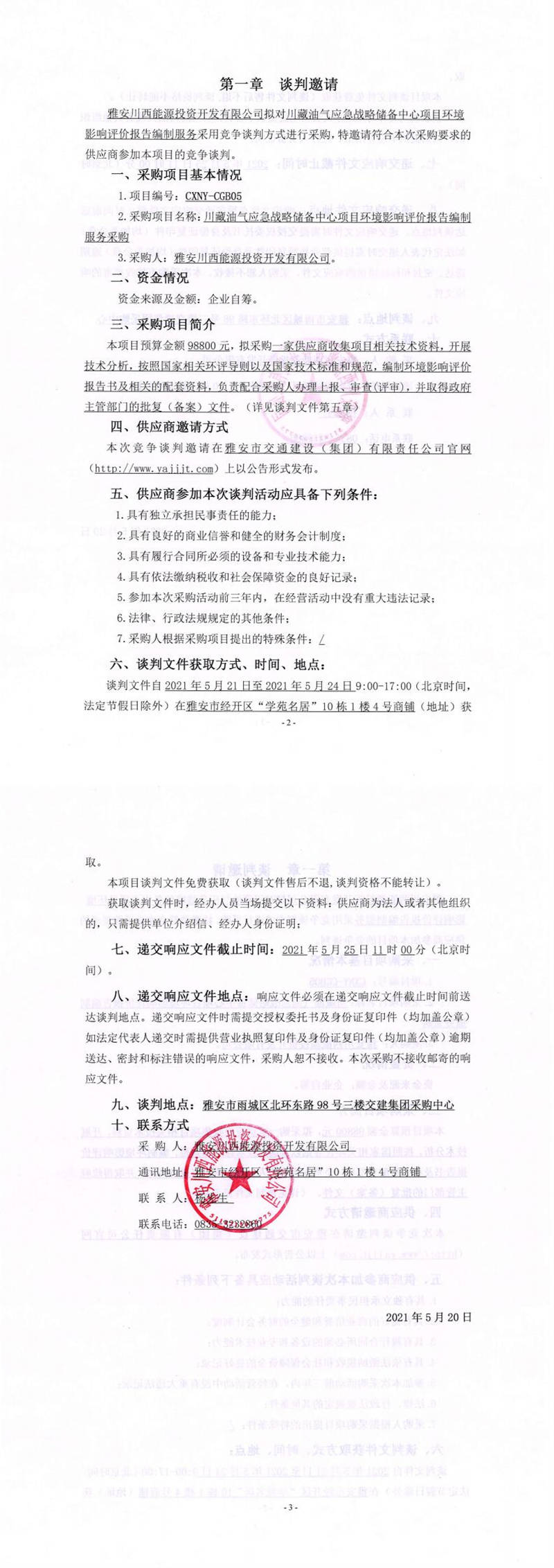 雅安川西能源投資開(kāi)發(fā)有限公司川藏油氣應(yīng)急戰(zhàn)略儲(chǔ)備中心項(xiàng)目環(huán)境影響評(píng)價(jià)報(bào)告編制服務(wù)采購(gòu)競(jìng)爭(zhēng)談判公告