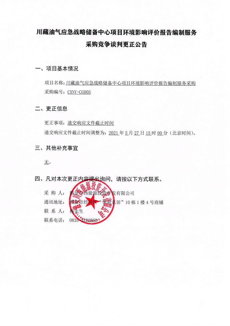 雅安川西能源投資開發(fā)有限公司川藏油氣應(yīng)急戰(zhàn)略儲(chǔ)備中心項(xiàng)目環(huán)境影響評(píng)價(jià)報(bào)告編制服務(wù)采購(gòu)競(jìng)爭(zhēng)談判更正公告