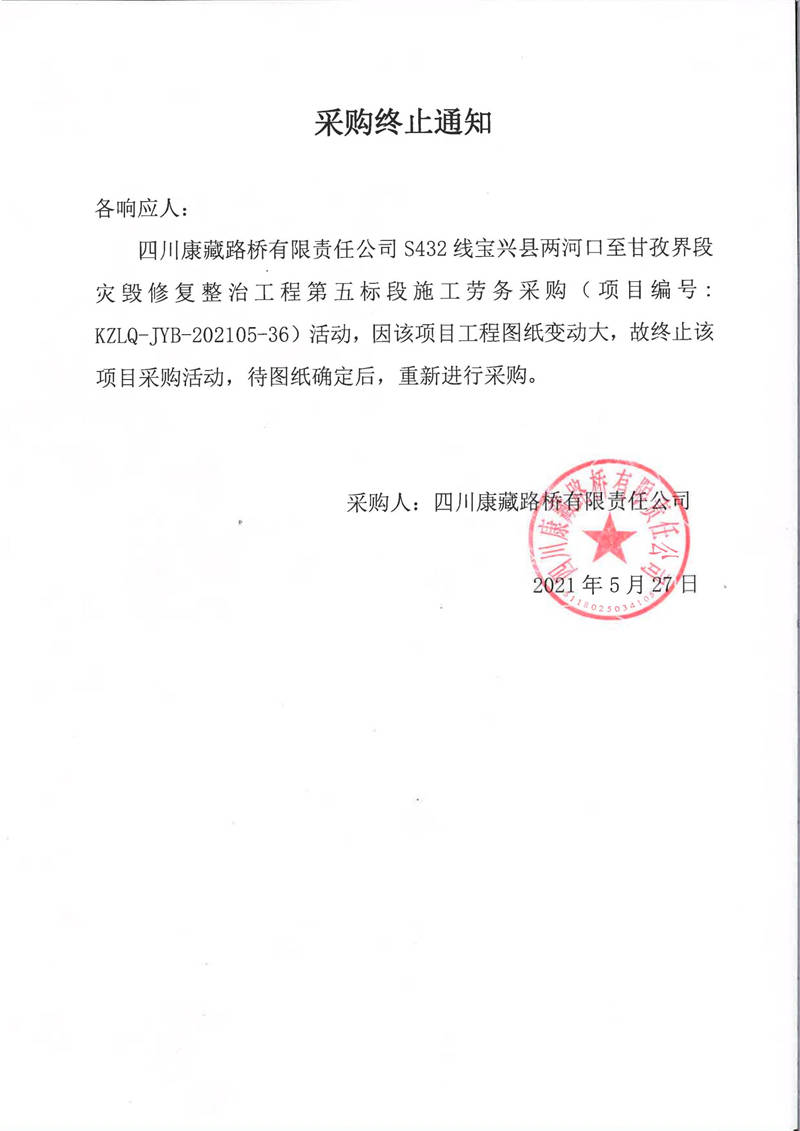 四川康藏路橋有限責(zé)任公司S432線寶興縣兩河口至甘孜界段災(zāi)毀修復(fù)整治工程第五標(biāo)段施工勞務(wù)采購終止通知