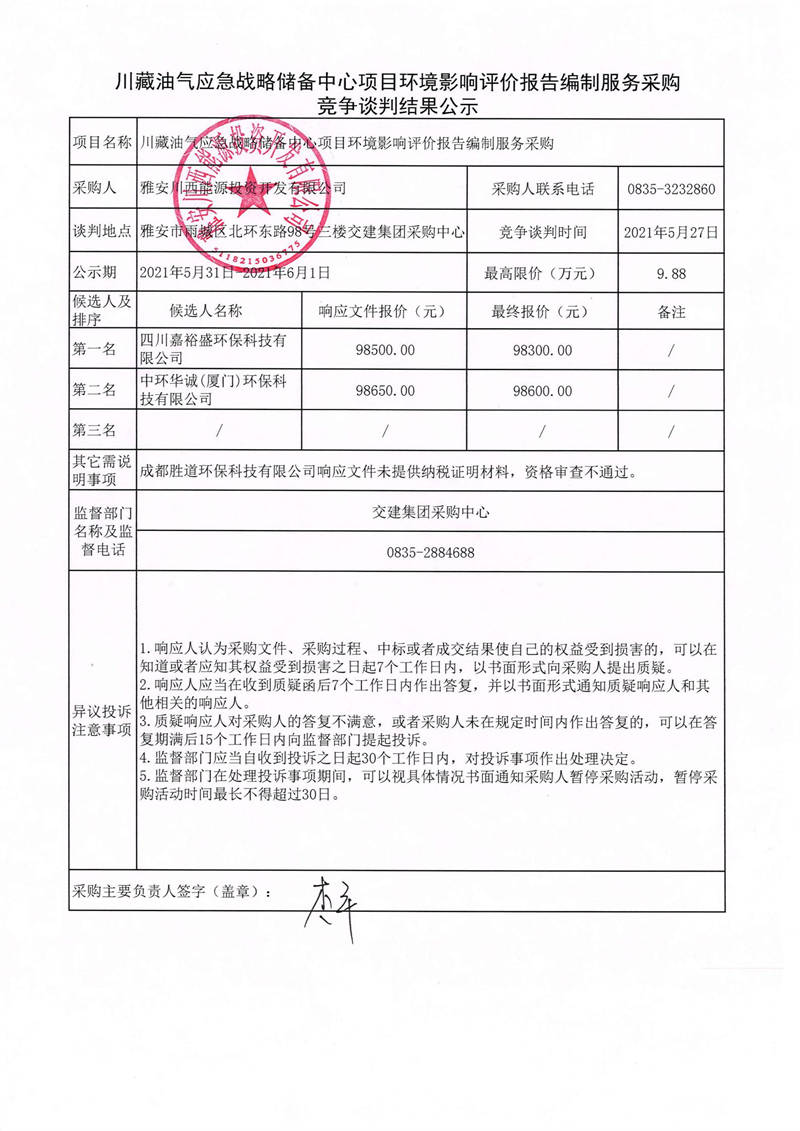 雅安川西能源投資開發(fā)有限公司川藏油氣應(yīng)急戰(zhàn)略儲備中心項(xiàng)目環(huán)境影響評價(jià)報(bào)告編制服務(wù)采購競爭性談判結(jié)果公示