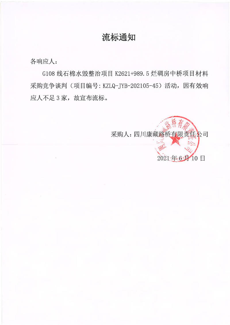四川康藏路橋有限責任公司G108線石棉水毀整治項目K2621+989.5爛碉房中橋項目材料采購競爭談判流標通知