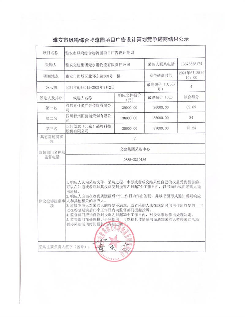 雅安交建集團(tuán)無水港物流有限責(zé)任公司雅安市鳳鳴綜合物流園項目廣告設(shè)計策劃競爭磋商結(jié)果公示