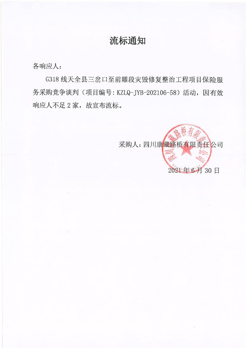 四川康藏路橋有限責(zé)任公司G318線天全縣三岔口至前雕段災(zāi)毀修復(fù)整治工程項(xiàng)目保險服務(wù)采購流標(biāo)通知