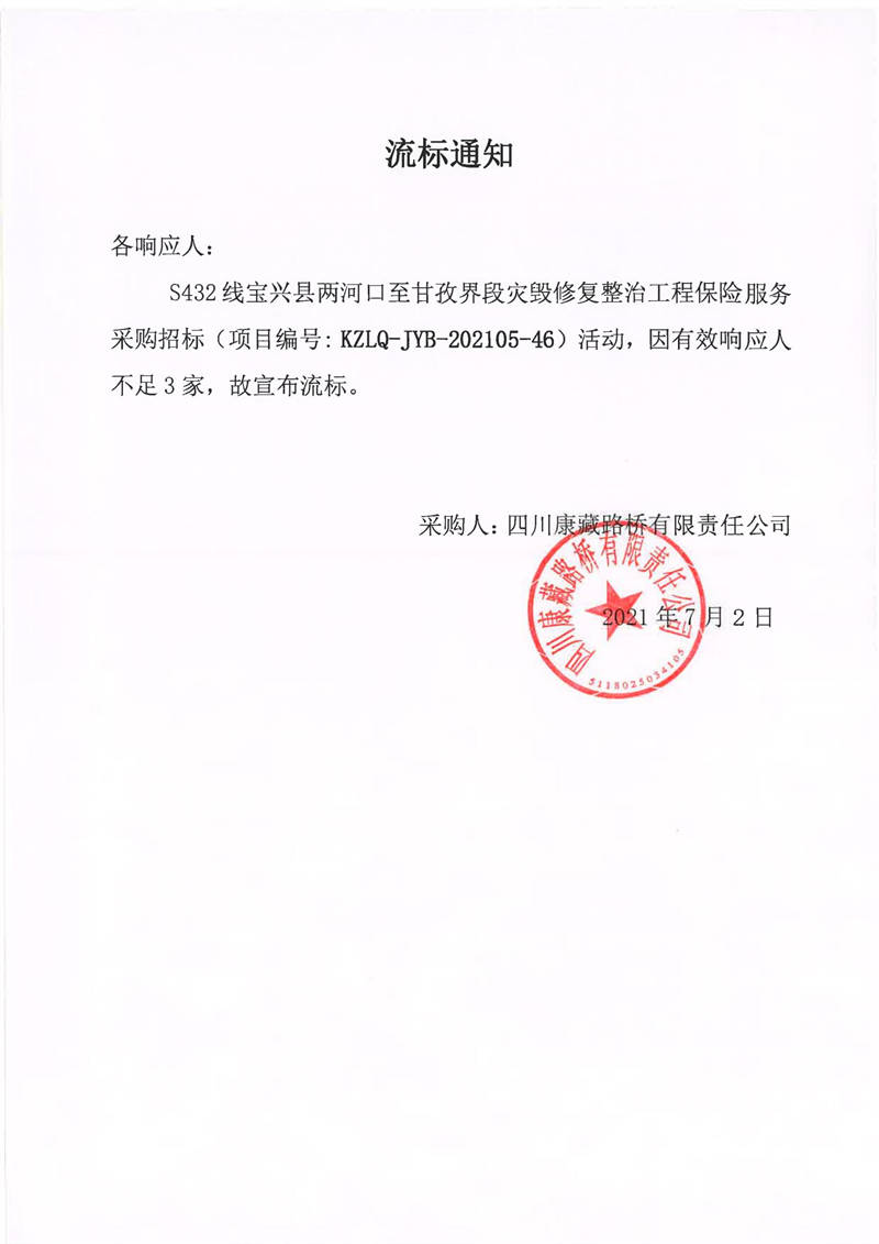 四川康藏路橋有限責任公司S432線寶興縣兩河口至甘孜界段災毀修復整治工程保險服務采購流標通知