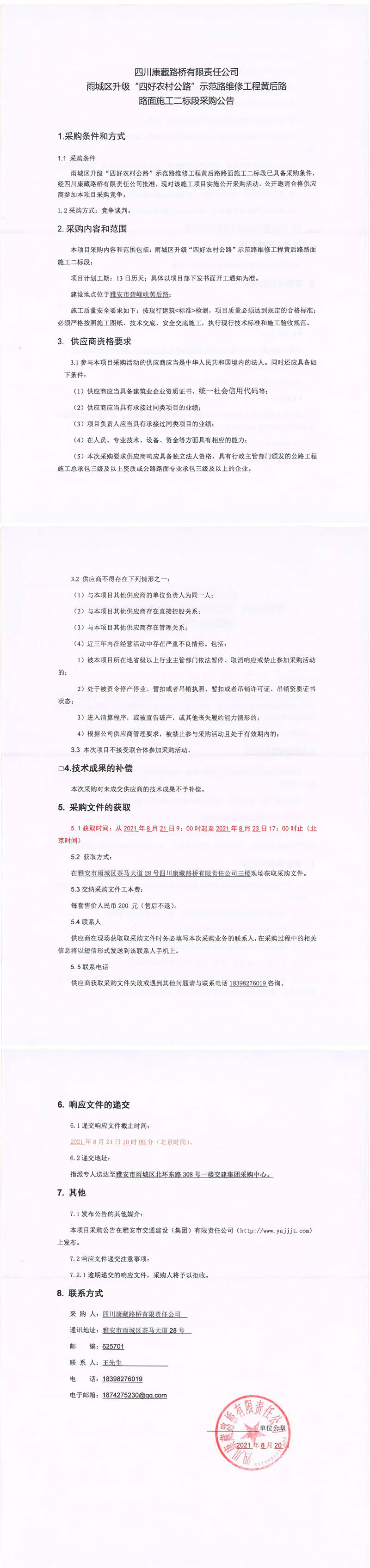 四川康藏路橋有限責(zé)任公司雨城區(qū)升級“四好農(nóng)村公路”示范路維修工程黃后路路面施工二標(biāo)段采購公告