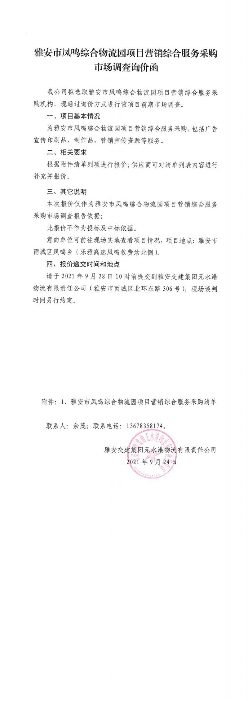 雅安交建集團(tuán)無水港物流有限責(zé)任公司雅安市鳳鳴綜合物流園項(xiàng)目營(yíng)銷綜合服務(wù)采購市場(chǎng)調(diào)查詢價(jià)函