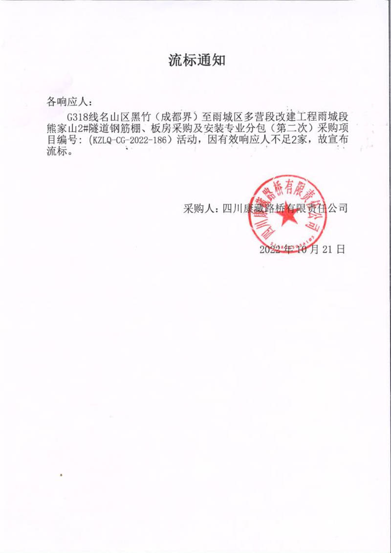 四川康藏路橋有限責(zé)任公司G318線名山區(qū)黑竹(成都界)至雨城區(qū)多營(yíng)段改建工程雨城段熊家山2#隧道鋼筋棚、板房采購(gòu)及安裝專業(yè)分包采購(gòu)(第二次)流標(biāo)通知
