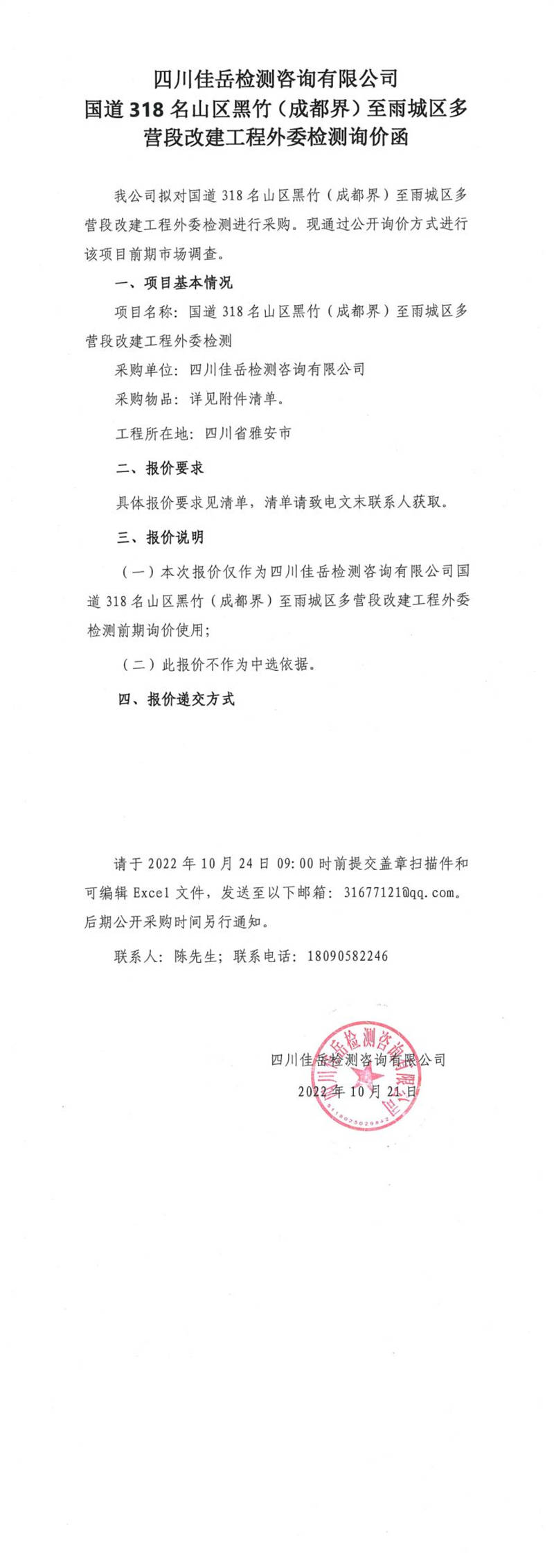 四川佳岳檢測咨詢有限公司國道318名山區(qū)黑竹(成都界)至雨城區(qū)多營段改建工程外委檢測詢價函