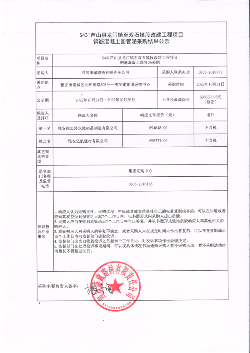 四川康藏路橋有限責任公司S431蘆山縣龍門鎮(zhèn)至雙石鎮(zhèn)段改建工程項目鋼筋混凝土圓管涵采購結果公示