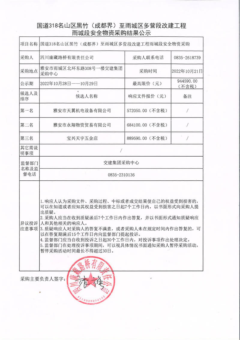 四川康藏路橋有限責(zé)任公司國(guó)道318名山區(qū)黑竹(成都界)至雨城區(qū)多營(yíng)段改建工程雨城段安全物資采購結(jié)果公示