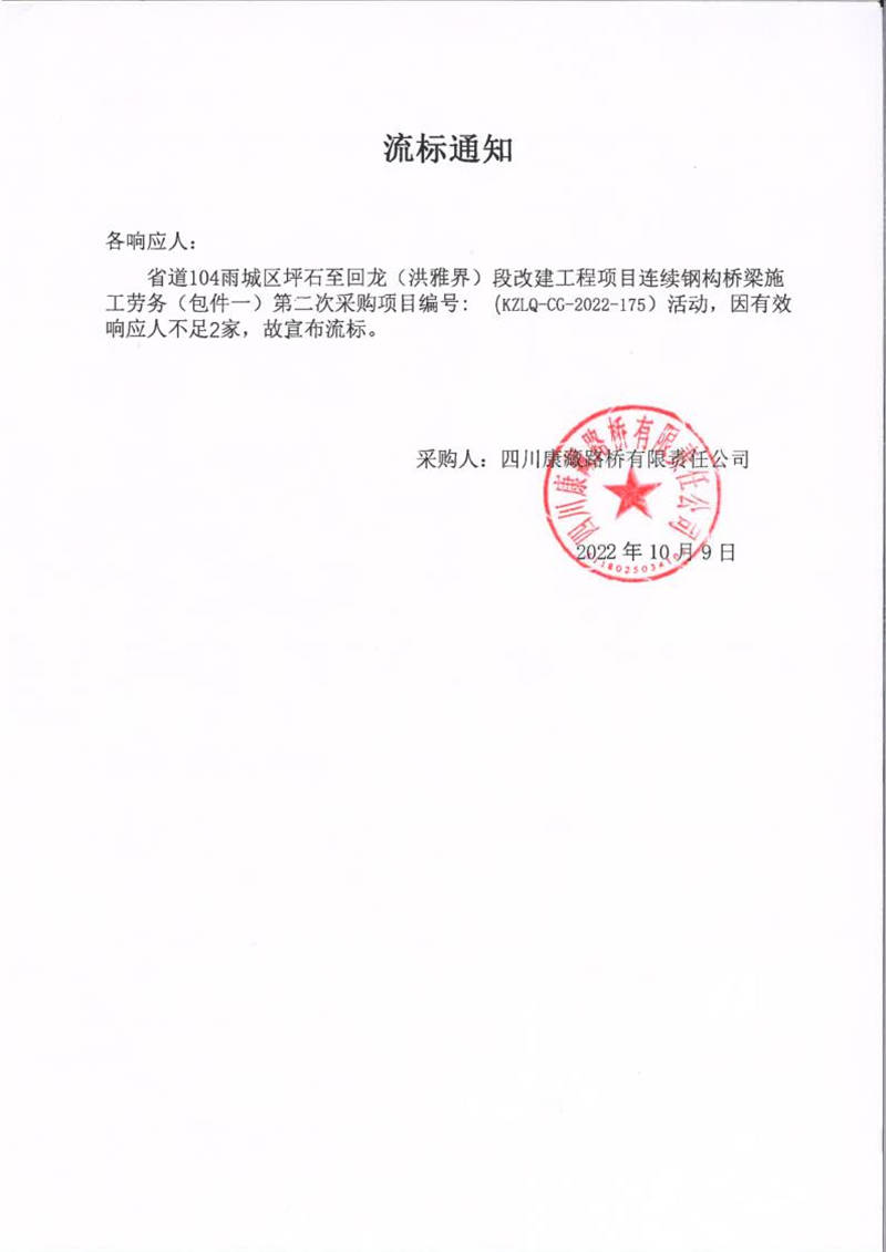 四川康藏路橋有限責任公司省道104雨城區(qū)坪石至回龍(洪雅界)段改建工程項目連續(xù)鋼構橋梁施工勞務(包件一)第二次采購項目流標通知