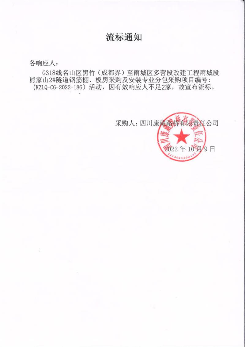 四川康藏路橋有限責(zé)任公司G318線名山區(qū)黑竹(成都界)至雨城區(qū)多營(yíng)段改建工程雨城段熊家山2#隧道鋼筋棚、板房采購(gòu)及安裝專業(yè)分包采購(gòu)項(xiàng)目流標(biāo)通知