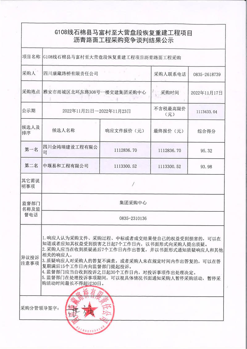 四川康藏路橋有限責(zé)任公司G108線石棉縣馬富村至大營盤段恢復(fù)重建工程項(xiàng)目瀝青路面工程采購競爭談判結(jié)果公示