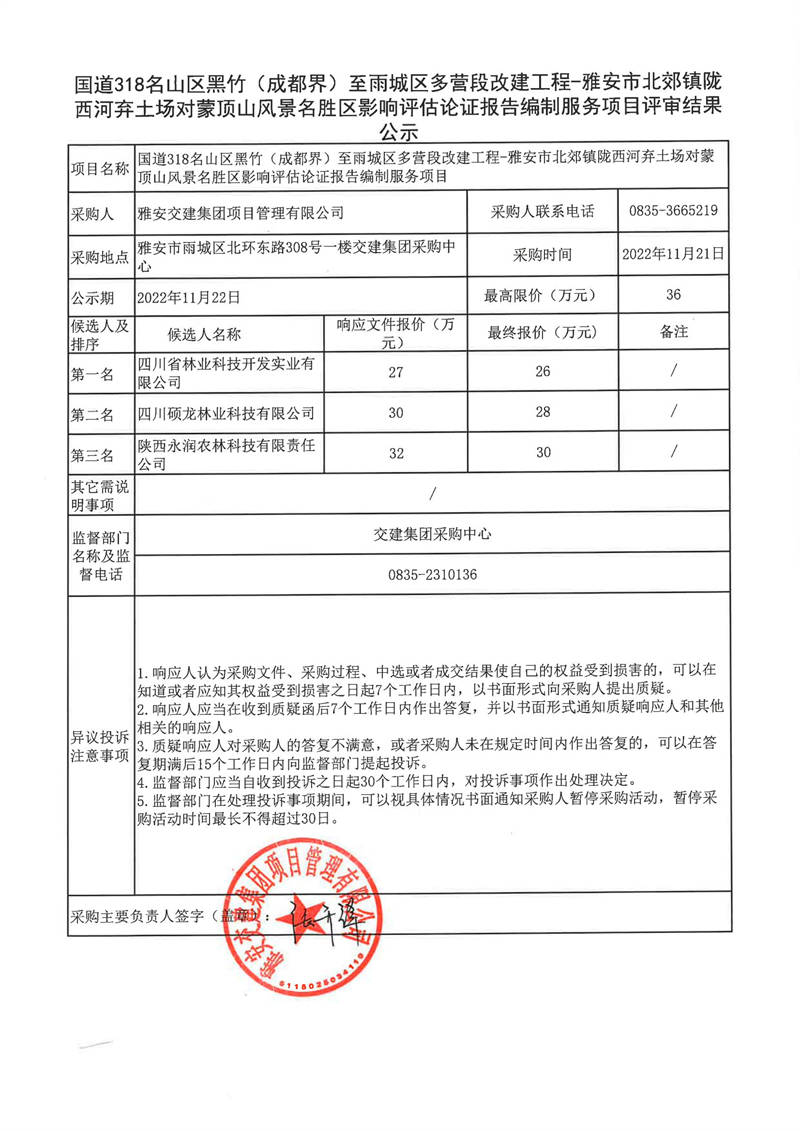 雅安交建集團項目管理有限公司國道318名山區(qū)黑竹(成都界)至雨城區(qū)多營段改建工程-雅安市北郊鎮(zhèn)隴西河棄土場對蒙頂山風景名勝區(qū)影響評估論證報告編制服務評審結(jié)果公示