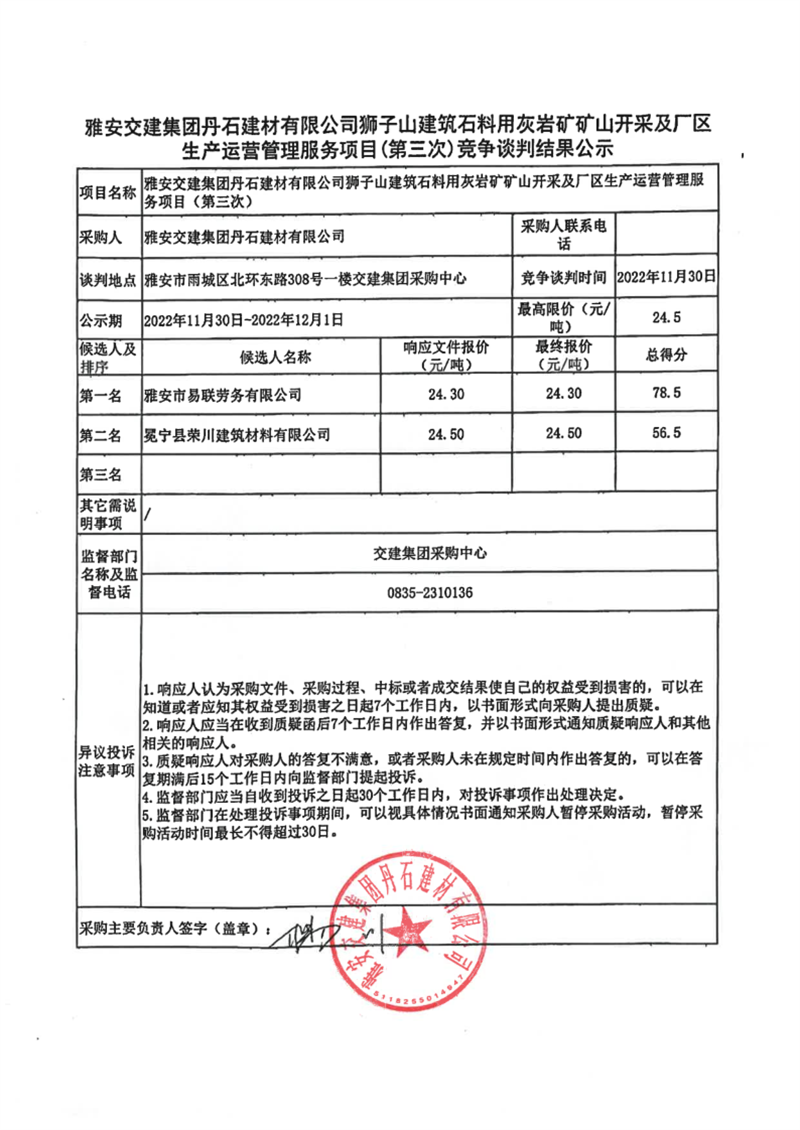 雅安交建集團丹石建材有限公司獅子山建筑石料用灰?guī)r礦礦山開采及廠區(qū)生產(chǎn)運營管理服務(wù)項目(第三次)競爭談判結(jié)果公示