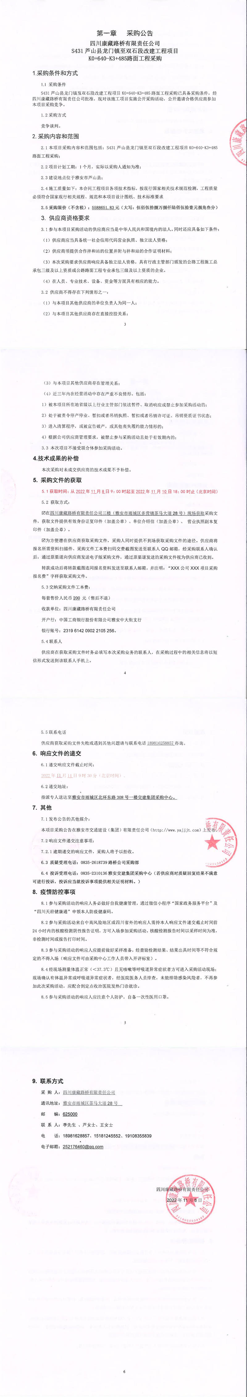 四川康藏路橋有限責(zé)任公司S431蘆山縣龍門鎮(zhèn)至雙石段改建工程項(xiàng)目K0+640-K3+485路面工程采購公告