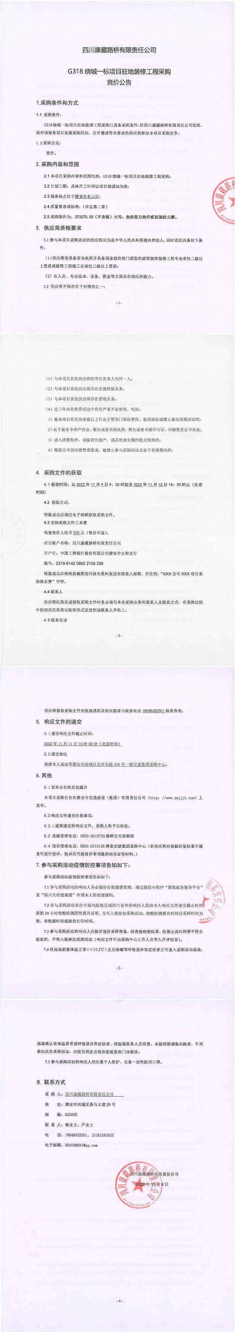 四川康藏路橋有限責(zé)任公司G318繞城一標(biāo)項(xiàng)目駐地裝修工程采購競(jìng)價(jià)公告