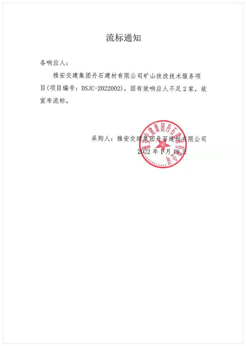 雅安交建集團丹石建材有限公司礦山技改技術(shù)服務(wù)項目流標(biāo)通知