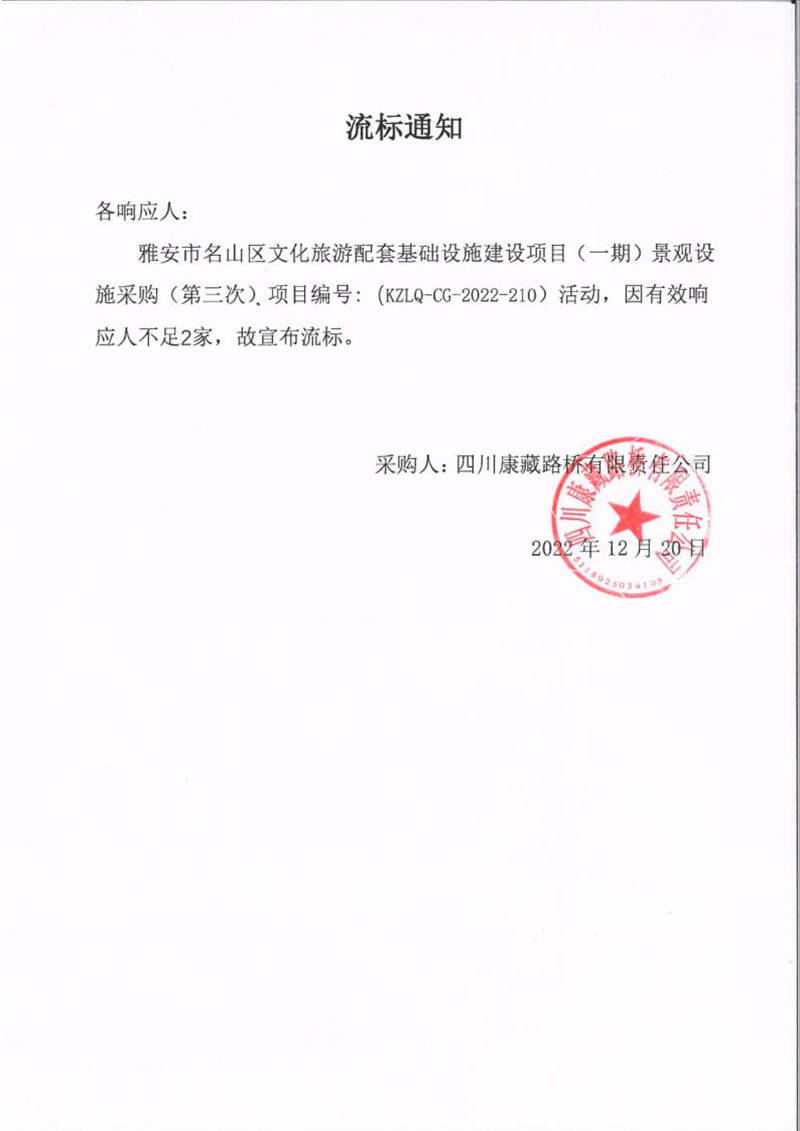 四川康藏路橋有限責(zé)任公司雅安市名山區(qū)文化旅游配套基礎(chǔ)設(shè)施建設(shè)項(xiàng)目(一期)景觀設(shè)施采購(gòu)(第三次)流標(biāo)通知