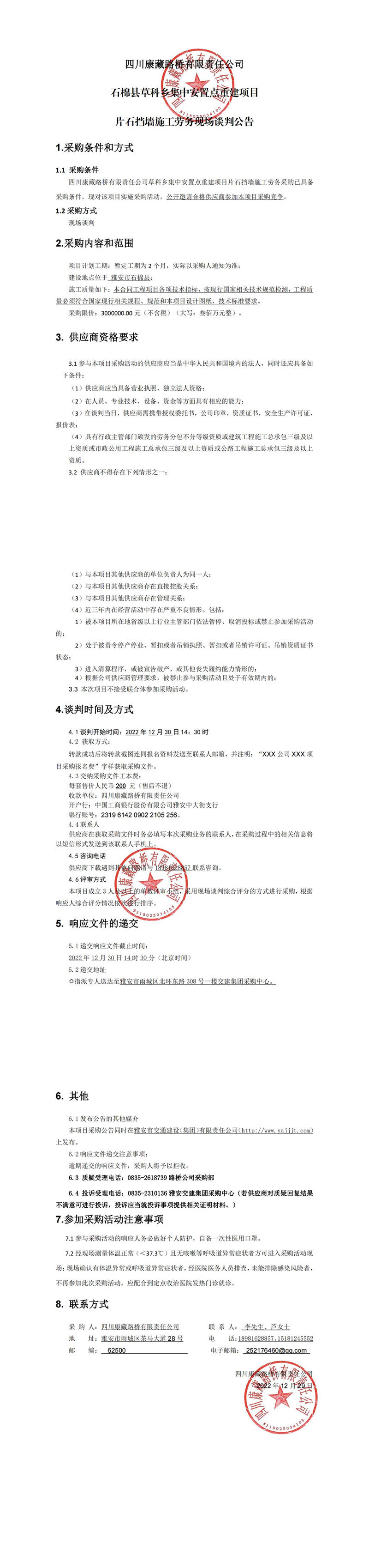 四川康藏路橋有限責(zé)任公司石棉縣草科鄉(xiāng)集中安置點(diǎn)重建項(xiàng)目片石擋墻施工勞務(wù)現(xiàn)場(chǎng)談判公告