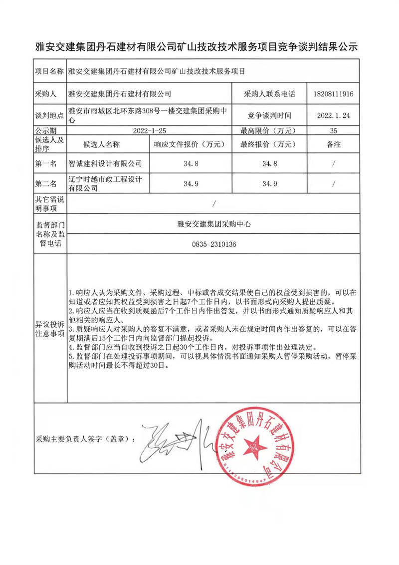 雅安交建集團(tuán)丹石建材有限公司礦山技改技術(shù)服務(wù)項(xiàng)目競爭談判結(jié)果公示