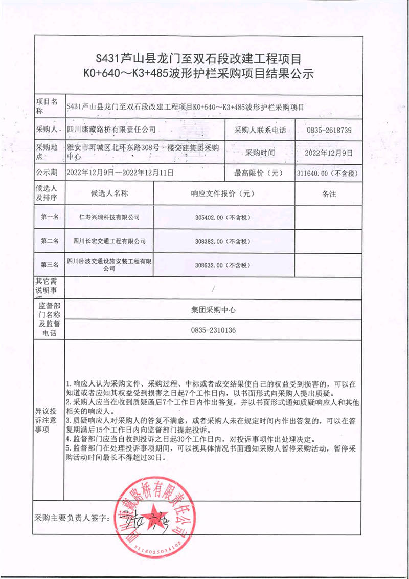 四川康藏路橋有限責(zé)任公司S431蘆山縣龍門至雙石段改建工程項目K0+640~K3+485波形護欄采購項目結(jié)果公示