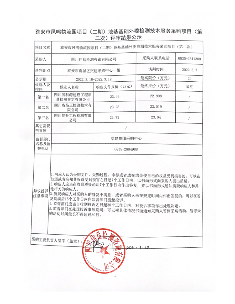 四川佳岳檢測(cè)咨詢有限公司雅安市鳳鳴物流園項(xiàng)目(二期)地基基礎(chǔ)外委檢測(cè)技術(shù)服務(wù)采購(gòu)項(xiàng)目(第二次)評(píng)審結(jié)果公示
