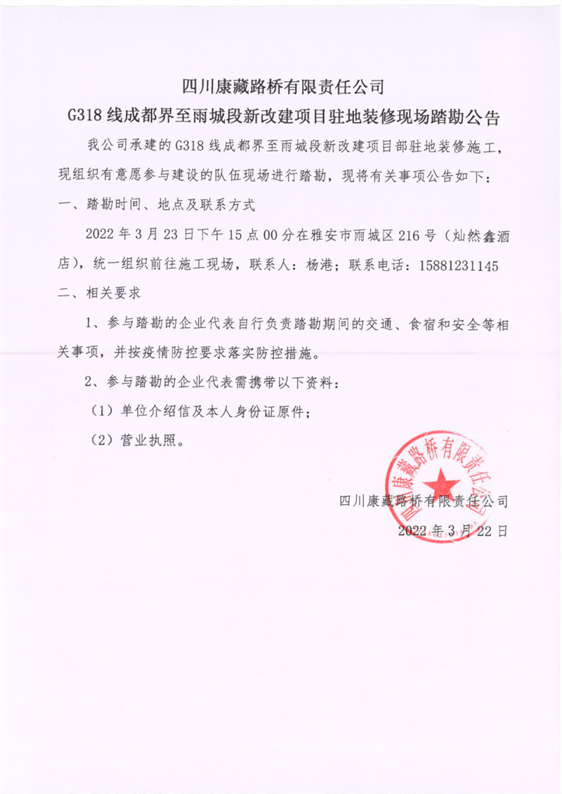 四川康藏路橋有限責(zé)任公司G318線成都界至雨城段新改建項(xiàng)目駐地裝修現(xiàn)場踏勘公告