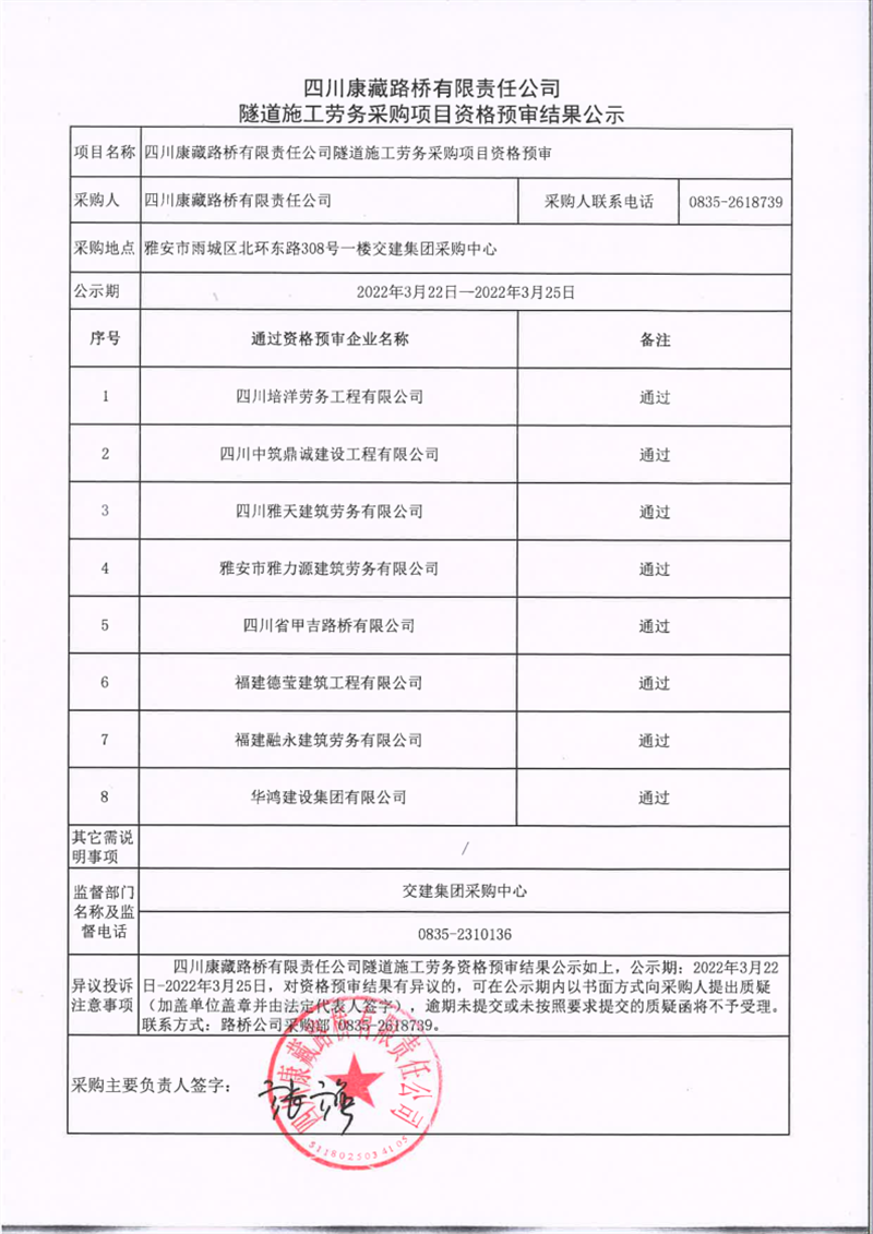 四川康藏路橋有限責任公司隧道施工勞務(wù)采購項目資格預審結(jié)果公示