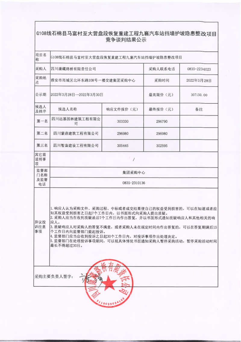 四川康藏路橋有限責(zé)任公司G108線石棉縣馬福村至大營(yíng)盤(pán)段恢復(fù)重建九襄汽車(chē)站擋墻護(hù)坡隱患整改項(xiàng)目競(jìng)爭(zhēng)談判結(jié)果公示