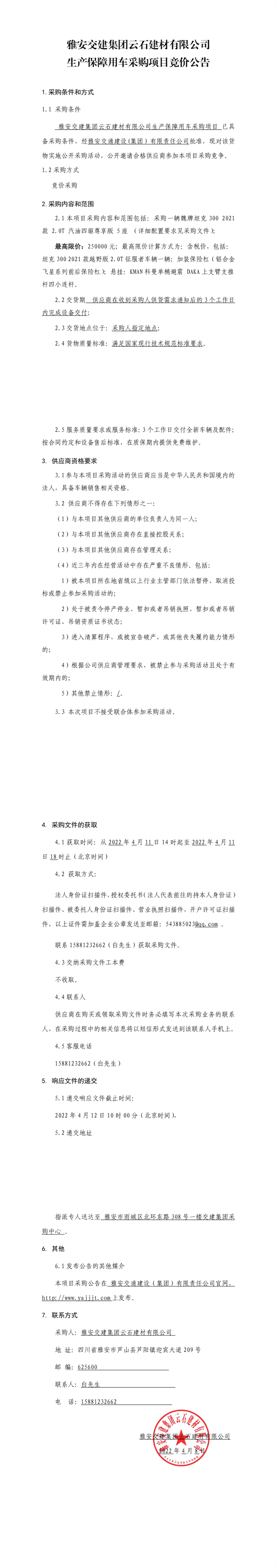 雅安交建集團云石建材有限公司生產保障用車采購項目競價公告